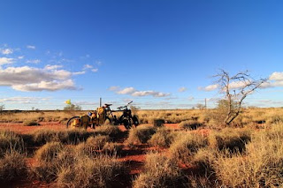 The following day the wind changes to the opposite direction, cars get rare, I cycle at a good speed and the horizon gets wider. I will arrive soon at the turn off which goes to Telfer mine, the road becomes rough. The way is blocked and some trucks are parked but nobody is around. I decide to continue, I don’t have enough water to stop too long. The track is wide and smooth, maintained for trucks. I stop to camp close to one of the only trees where I can lean my bike. The nights are peaceful since my departure but really cold, I often wake up. I sleep 11h a night; my body gets use to effort again. The following day I ride half of the track before Telfer, the wind is facing me again, just a long red stretch, muddy sometimes, flat and desert horizon, few trucks head a large dusty cloud which cover me for minutes when they pass me. Sometimes the 4wd stop to ask me what I am doing here and they take a photo. They propose some food or water. At the end of the day, before arriving at the turn to the mine, I stop close to a windmill with a water tank, apparently clean. I try and fill my jerry cans, I avoid 60 kms extra instead of going to Telfer. Just after heading to the last 150 kms, I stop for the night. In the morning, the wind decreased, and I start my day on a soft sandy surface. The red saturated color of the sand is hypnotic, and twists your vision by not seeing holes and corrugations. The morning is peaceful, I only hear the friction of my tires on the fine sand, and my Billy cup attached at the back. Sometimes the sand gives place to a white rocky broken ground, sometimes sharp gravels on soft ground. I progress slowly, I have to stare all the time at the road to avoid holes or rocks. This is my 6th day on the road, I haven’t seen any habitations since Marble Bar. I am now in the heart of the